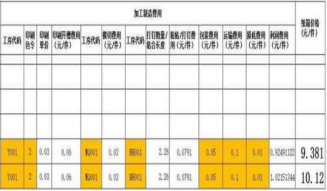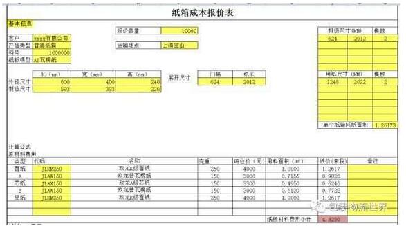 在黄色区域输入相关数据信息,表格将自动计算所有数据,自动生成最终纸箱价格。